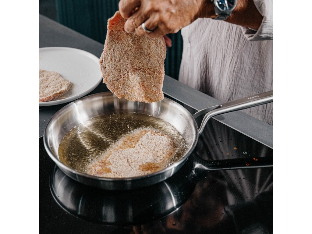 Dostalo se mi toho privilegia, že jsem si mohl v rámci spolupráce se značkou FABINI navzorovat svou vlastní sadu pánviček, kterou bych chtěl doma mít pro všechny základní úkony. Navzorovali jsme společně tuhle mělkou nerezovou pánvičku. Jak dělaná na opékání řízků. Je multifunkční a z pětivrstvé nerezové oceli, takže se rychle nahřeje a skvěle vede a udržuje naakumulovanou teplotu. Odstranili jsme z vnitřní strany nýty, sice drobná úprava, ale usnadní míchání po obvodu i čištění.